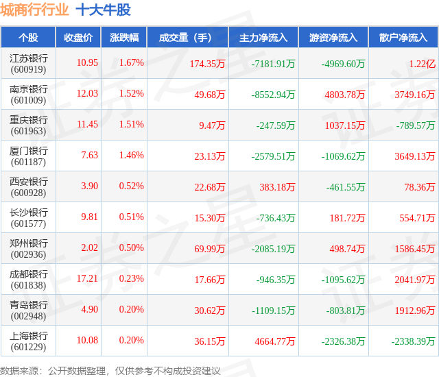 个股表现方面,城商行行业当日领涨股为江苏银行(600919),该股当日报收10.95,上涨1.67%,成交量174.35万,主力资金净流出7181.91万元。南京银行(601009)以上涨1.52%紧随其后,该股当日成交量49.68万,主力资金净流出8552.94万元。除此之外,重庆银行(601963)、厦门银行(601187)、西安银行(600928)均进入当日牛股之列。具体个股列表见下表: