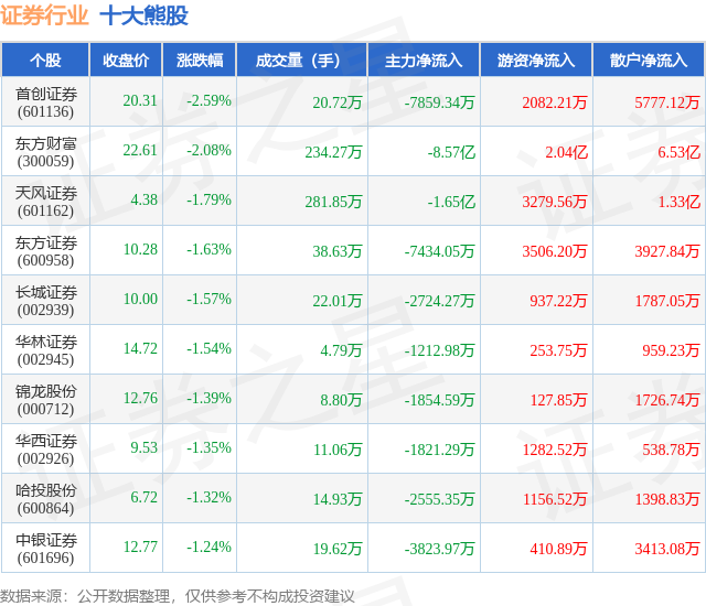 个股表现方面,证券行业当日领跌股为首创证券(601136),该股当日报收20.31,下跌2.59%,成交量20.72万,主力资金净流出7859.34万元。东方财富(300059)以下跌2.08%紧随其后,该股当日成交量234.27万,主力资金净流出8.57亿元。除此之外,天风证券(601162)、东方证券(600958)、长城证券(002939)均进入当日熊股之列。具体个股列表见下表: