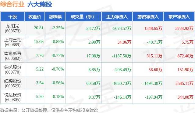 个股表现方面,综合行业当日领跌股为东阳光(600673),该股当日报收20.81,下跌2.35%,成交量23.72万,主力资金净流出5073.57万元。上海三毛(600689)以下跌0.85%紧随其后,该股当日成交量2.9万,主力资金净流入34.96万元。除此之外,南京新百(600682)、综艺股份(600770)、红棉股份(000523)均进入当日熊股之列。具体个股列表见下表: