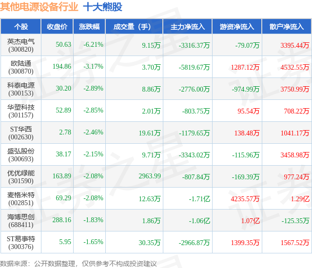 个股表现方面,其他电源设备行业当日领跌股为英杰电气(300820),该股当日报收50.63,下跌6.21%,成交量9.15万,主力资金净流出3316.37万元。欧陆通(300870)以下跌3.17%紧随其后,该股当日成交量3.7万,主力资金净流出5819.67万元。除此之外,科泰电源(300153)、华塑科技(301157)、ST华西(002630)均进入当日熊股之列。具体个股列表见下表: