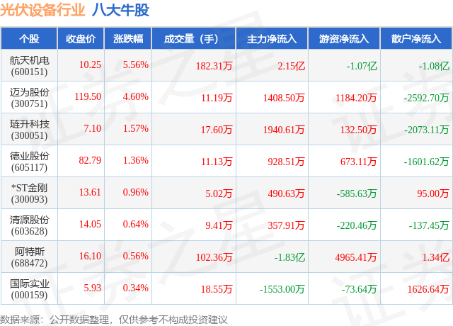 个股表现方面,光伏设备行业当日领涨股为航天机电(600151),该股当日报收10.25,上涨5.56%,成交量182.31万,主力资金净流入2.15亿元。迈为股份(300751)以上涨4.6%紧随其后,该股当日成交量11.19万,主力资金净流入1408.5万元。除此之外,琏升科技(300051)、德业股份(605117)、*ST金刚(300093)均进入当日牛股之列。具体个股列表见下表: