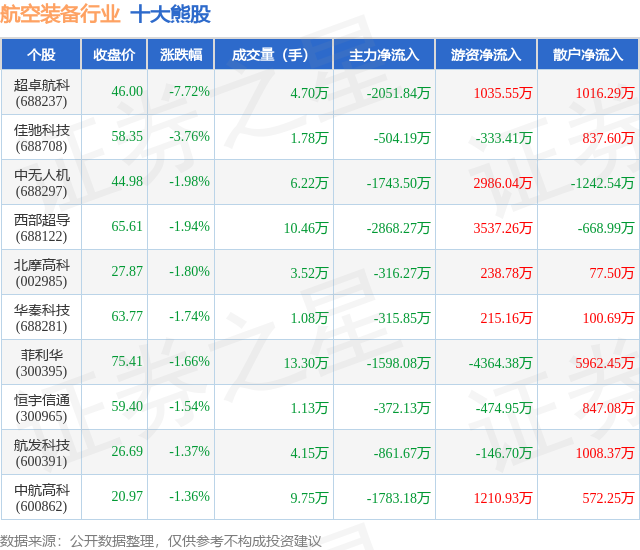 个股表现方面,航空装备行业当日领跌股为超卓航科(688237),该股当日报收46.0,下跌7.72%,成交量4.7万,主力资金净流出2051.84万元。佳驰科技(688708)以下跌3.76%紧随其后,该股当日成交量1.78万,主力资金净流出504.19万元。除此之外,中无人机(688297)、西部超导(688122)、北摩高科(002985)均进入当日熊股之列。具体个股列表见下表: