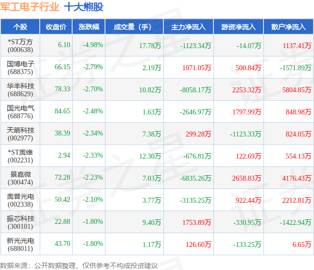 个股表现方面,军工电子行业当日领跌股为*ST万方(000638),该股当日报收6.1,下跌4.98%,成交量17.78万,主力资金净流出1123.34万元。国博电子(688375)以下跌2.79%紧随其后,该股当日成交量2.19万,主力资金净流入1071.05万元。除此之外,华丰科技(688629)、国光电气(688776)、天箭科技(002977)均进入当日熊股之列。具体个股列表见下表:
