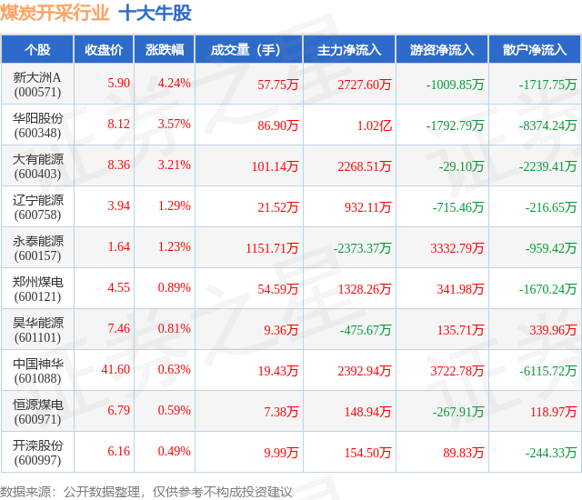 个股表现方面,煤炭开采行业当日领涨股为新大洲A(000571),该股当日报收5.9,上涨4.24%,成交量57.75万,主力资金净流入2727.6万元。华阳股份(600348)以上涨3.57%紧随其后,该股当日成交量86.9万,主力资金净流入1.02亿元。除此之外,大有能源(600403)、辽宁能源(600758)、永泰能源(600157)均进入当日牛股之列。具体个股列表见下表: