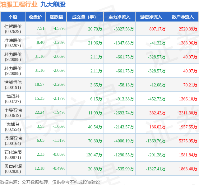 个股表现方面,油服工程行业当日领跌股为仁智股份(002629),该股当日报收7.51,下跌4.57%,成交量20.7万,主力资金净流出3327.56万元。准油股份(002207)以下跌3.23%紧随其后,该股当日成交量21.96万,主力资金净流出1347.63万元。除此之外,科力股份(920088)、科力股份(920088)、潜能恒信(300191)均进入当日熊股之列。具体个股列表见下表: