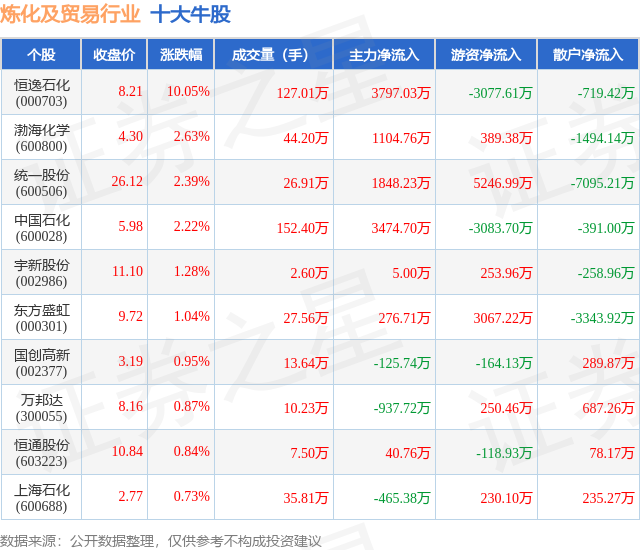 个股表现方面,炼化及贸易行业当日领涨股为恒逸石化(000703),该股当日报收8.21,上涨10.05%,成交量127.01万,主力资金净流入3797.03万元。渤海化学(600800)以上涨2.63%紧随其后,该股当日成交量44.2万,主力资金净流入1104.76万元。除此之外,统一股份(600506)、中国石化(600028)、宇新股份(002986)均进入当日牛股之列。具体个股列表见下表: