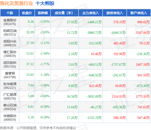 个股表现方面,炼化及贸易行业当日领跌股为宝莫股份(002476),该股当日报收6.26,下跌2.95%,成交量27.95万,主力资金净流出1468.21万元。和顺石油(603353)以下跌2.65%紧随其后,该股当日成交量15.72万,主力资金净流出3880.75万元。除此之外,岳阳兴长(000819)、博汇股份(300839)、润贝航科(001316)均进入当日熊股之列。具体个股列表见下表: