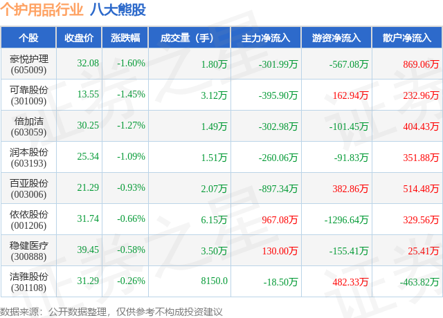 个股表现方面,个护用品行业当日领跌股为豪悦护理(605009),该股当日报收32.08,下跌1.6%,成交量1.8万,主力资金净流出301.99万元。可靠股份(301009)以下跌1.45%紧随其后,该股当日成交量3.12万,主力资金净流出395.9万元。除此之外,倍加洁(603059)、润本股份(603193)、百亚股份(003006)均进入当日熊股之列。具体个股列表见下表: