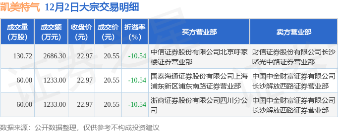 证券之星消息,12月2日凯美特气发生大宗交易,交易数据如下: