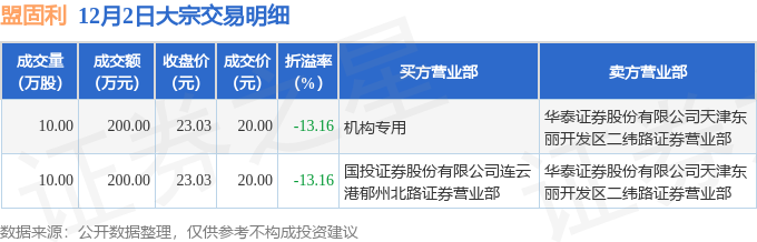 证券之星消息,12月2日盟固利发生大宗交易,交易数据如下: