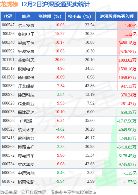 龙虎榜中有沪股通/深股通专用席位(北向资金)现身的个股共19家,其中航天发展以净买入1.4亿元排名第一。详情见下表: