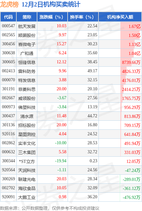 当日公布的交易所龙虎榜中有机构专用席位现身的个股共27家,其中航天发展以净买入1.67亿元排名第一。详情见下表: