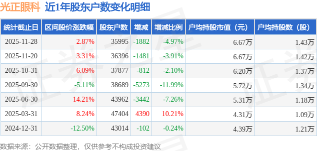 从股价来看,2025年10月31日至2025年11月28日,光正眼科区间涨幅为2.87%,在此期间股东户数减少1882.0户,减幅为4.97%。