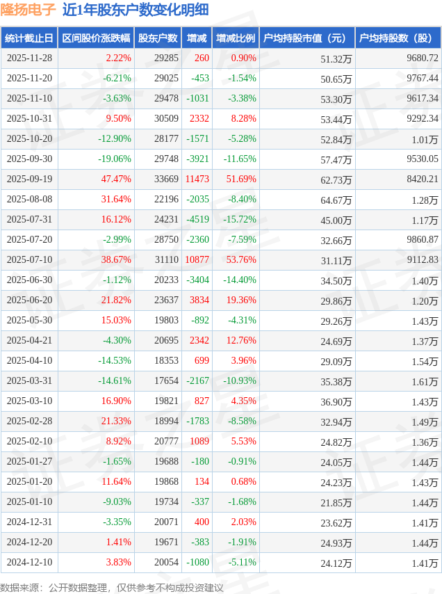 从股价来看,2025年11月20日至2025年11月28日,隆扬电子区间涨幅为2.22%,在此期间股东户数增加260.0户,增幅为0.9%。