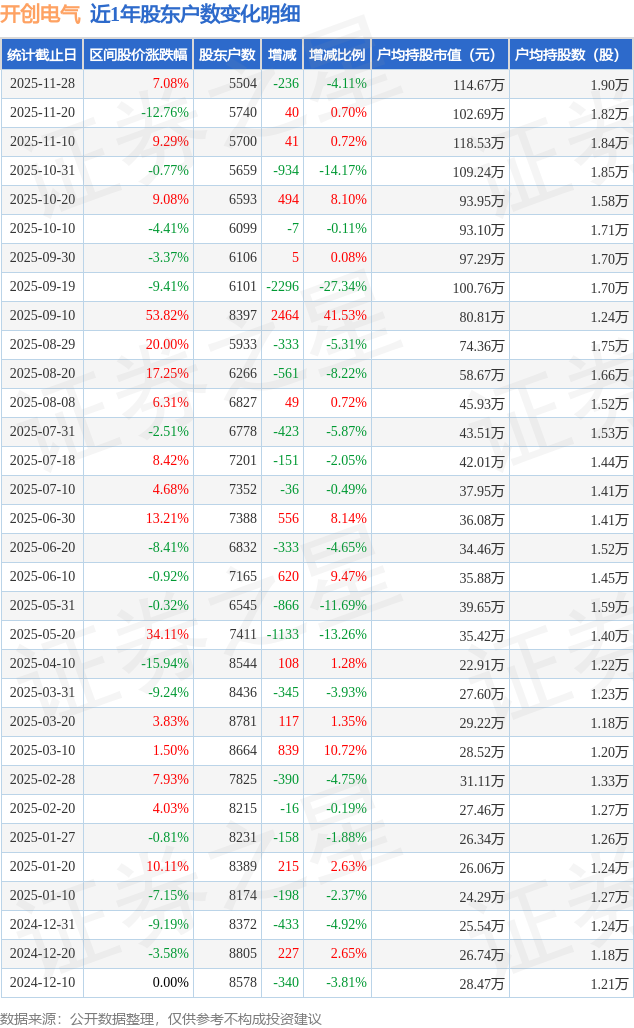 从股价来看,2025年11月20日至2025年11月28日,开创电气区间涨幅为7.08%,在此期间股东户数减少236.0户,减幅为4.11%。