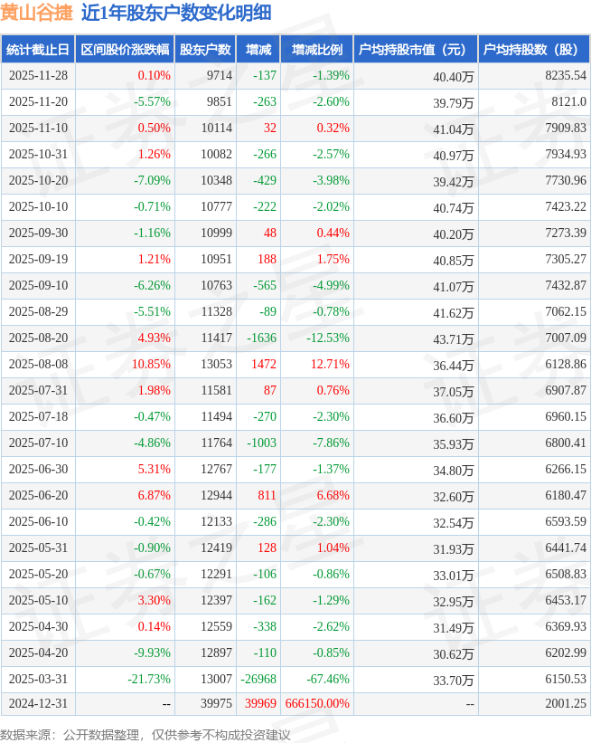 从股价来看,2025年11月20日至2025年11月28日,黄山谷捷区间涨幅为0.1%,在此期间股东户数减少137.0户,减幅为1.39%。
