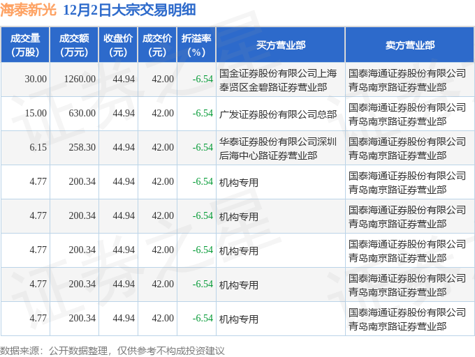 证券之星消息,12月2日海泰新光发生大宗交易,交易数据如下: