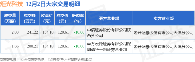 证券之星消息,12月2日炬光科技发生大宗交易,交易数据如下: