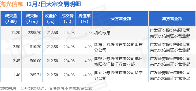 证券之星消息,12月2日海光信息发生大宗交易,交易数据如下: