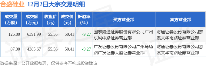证券之星消息,12月2日合盛硅业发生大宗交易,交易数据如下: