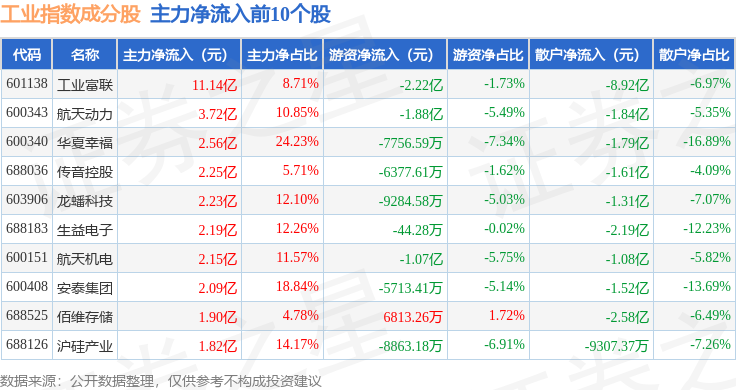 资金流向方面,工业指数(000004)成份股当日主力资金净流出合计143.89亿元,游资资金净流入合计49.6亿元,散户资金净流入合计94.29亿元。成份股资金流向详情见下表: