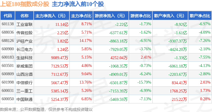 资金流向方面,上证180(000010)指数成份股当日主力资金净流出合计75.17亿元,游资资金净流入合计24.28亿元,散户资金净流入合计50.89亿元。成份股资金流向详情见下表: