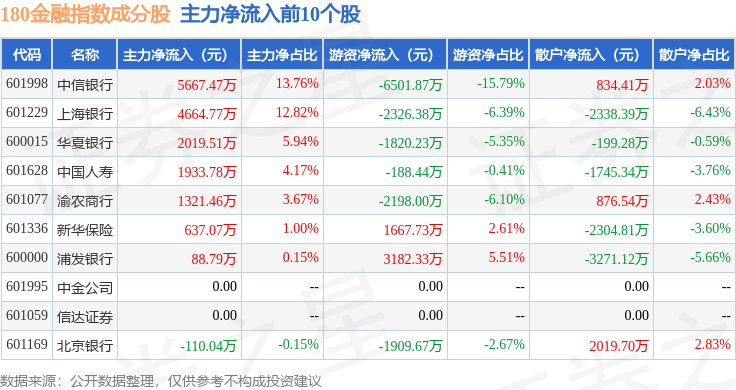 资金流向方面,180金融(000018)指数成份股当日主力资金净流出合计19.77亿元,游资资金净流入合计5.99亿元,散户资金净流入合计13.78亿元。成份股资金流向详情见下表: