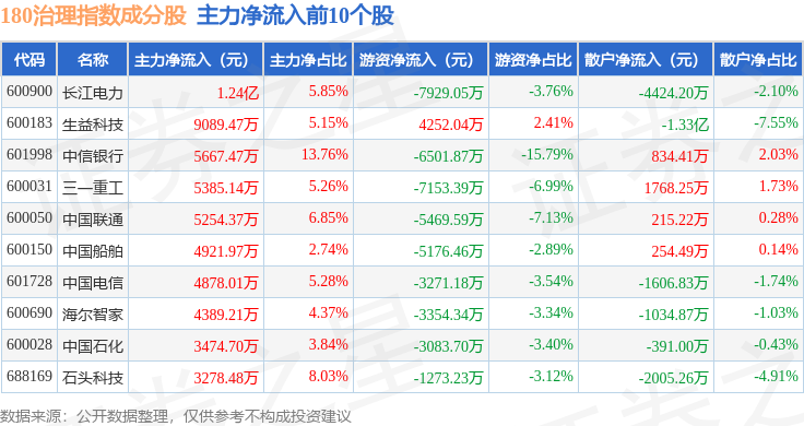 资金流向方面,180治理(000021)指数成份股当日主力资金净流出合计27.98亿元,游资资金净流入合计8.8亿元,散户资金净流入合计19.18亿元。成份股资金流向详情见下表:
