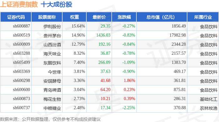 证券之星消息,12月2日,上证消费(000036)指数报收于11216.95点,跌0.59%,成交101.78亿元,换手率0.64%。当日该指数成份股中,上涨的有11家,安琪酵母以1.86%的涨幅领涨,下跌的有19家,舍得酒业以3.12%的跌幅领跌。