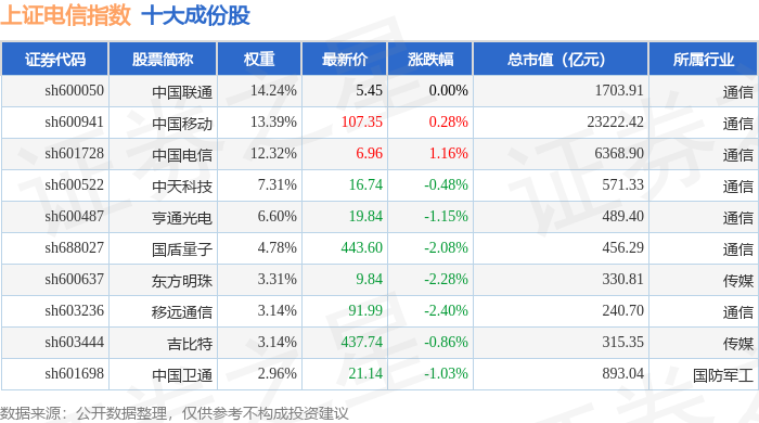 证券之星消息,12月2日,上证电信(000040)指数报收于3880.73点,跌0.69%,成交173.96亿元,换手率0.65%。当日该指数成份股中,上涨的有5家,中国电信以1.16%的涨幅领涨,下跌的有22家,中国电影以4.31%的跌幅领跌。