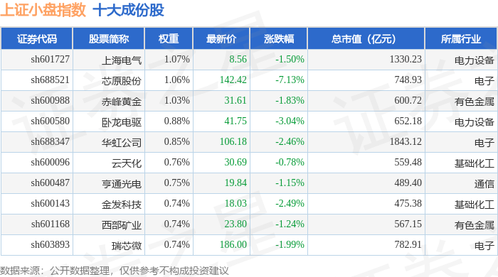 证券之星消息,12月2日,上证小盘(000045)指数报收于5494.66点,跌0.95%,成交1365.9亿元,换手率1.31%。当日该指数成份股中,上涨的有80家,彤程新材以6.31%的涨幅领涨,下跌的有226家,芯原股份以7.13%的跌幅领跌。