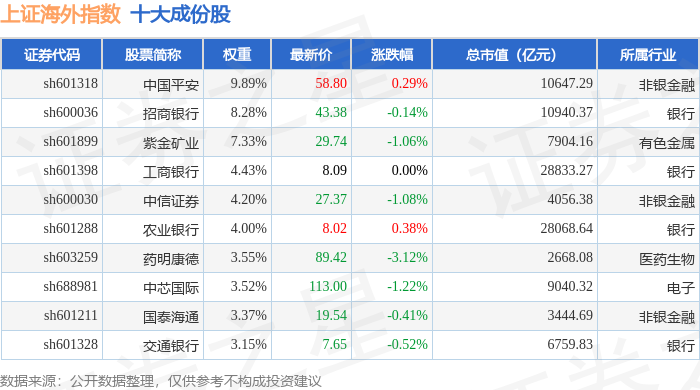 证券之星消息,12月2日,上证海外(000054)指数报收于1560.29点,跌0.34%,成交619.56亿元,换手率0.24%。当日该指数成份股中,上涨的有21家,中国石化以2.22%的涨幅领涨,下跌的有38家,中远海能以8.46%的跌幅领跌。