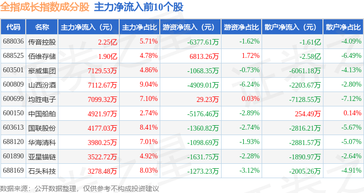 资金流向方面,全指成长(000057)指数成份股当日主力资金净流出合计56.99亿元,游资资金净流入合计24.35亿元,散户资金净流入合计32.64亿元。成份股资金流向详情见下表: