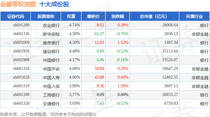 证券之星消息,12月2日,金融等权(000076)指数报收于5679.15点,涨0.01%,成交283.5亿元,换手率0.2%。当日该指数成份股中,上涨的有9家,江苏银行以1.67%的涨幅领涨,下跌的有17家,中国银河以1.19%的跌幅领跌。
