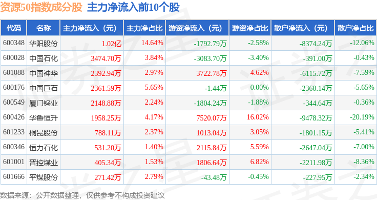 资金流向方面,资源50(000092)指数成份股当日主力资金净流出合计20.5亿元,游资资金净流入合计5.09亿元,散户资金净流入合计15.41亿元。成份股资金流向详情见下表: