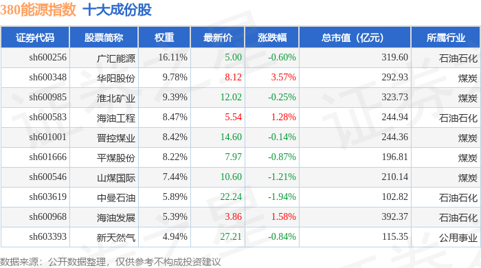 380能源(000104)指数十大成份股详情如下: