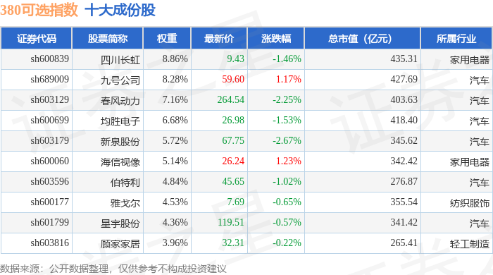 证券之星消息,12月2日,380可选(000107)指数报收于5600.7点,跌0.47%,成交82.84亿元,换手率0.89%。当日该指数成份股中,上涨的有15家,莱克电气以6.75%的涨幅领涨,下跌的有18家,新泉股份以2.67%的跌幅领跌。