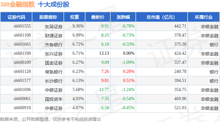 证券之星消息,12月2日,380金融(000110)指数报收于4202.63点,跌0.3%,成交36.37亿元,换手率0.6%。当日该指数成份股中,上涨的有6家,江苏金租以1.78%的涨幅领涨,下跌的有12家,中银证券以1.24%的跌幅领跌。