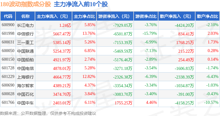 资金流向方面,180波动(000129)指数成份股当日主力资金净流出合计30.97亿元,游资资金净流入合计7.64亿元,散户资金净流入合计23.33亿元。成份股资金流向详情见下表: