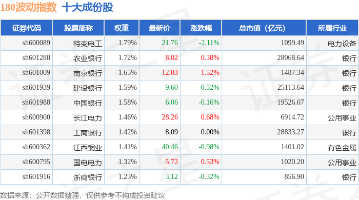 证券之星消息,12月2日,180波动(000129)指数报收于15390.32点,跌0.11%,成交677.85亿元,换手率0.26%。当日该指数成份股中,上涨的有36家,中国石化以2.22%的涨幅领涨,下跌的有53家,特变电工以2.11%的跌幅领跌。