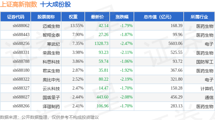 证券之星消息,12月2日,上证高新(000131)指数报收于3561.81点,跌1.84%,成交256.66亿元,换手率1.26%。当日该指数成份股中,上涨的有4家,臻镭科技以3.32%的涨幅领涨,下跌的有45家,芯原股份以7.13%的跌幅领跌。
