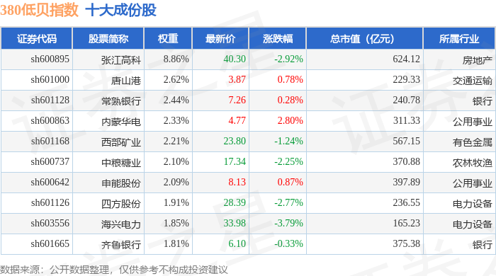 380低贝(000138)指数十大成份股详情如下: