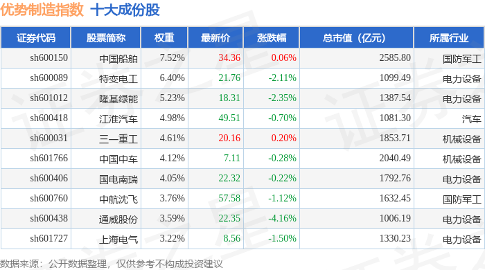 证券之星消息,12月2日,优势制造(000146)指数报收于7411.46点,跌1.05%,成交350.54亿元,换手率0.98%。当日该指数成份股中,上涨的有9家,航天电子以3.01%的涨幅领涨,下跌的有39家,通威股份以4.16%的跌幅领跌。