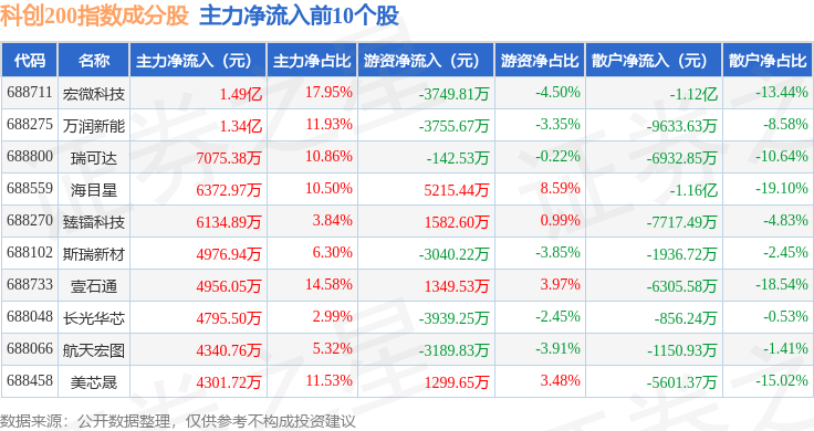 资金流向方面,科创200(000699)指数成份股当日主力资金净流出合计7.4亿元,游资资金净流入合计7.53亿元,散户资金净流出合计1207.51万元。成份股资金流向详情见下表: