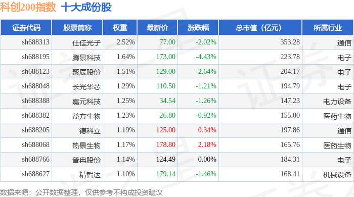 证券之星消息,12月2日,科创200(000699)指数报收于1222.01点,跌1.23%,成交409.21亿元,换手率2.13%。当日该指数成份股中,上涨的有36家,宏微科技以15.85%的涨幅领涨,下跌的有163家,奥浦迈以8.01%的跌幅领跌。