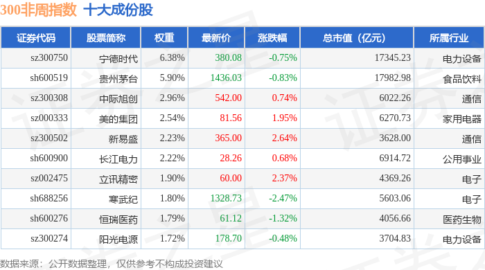 300非周(000969)指数十大成份股详情如下: