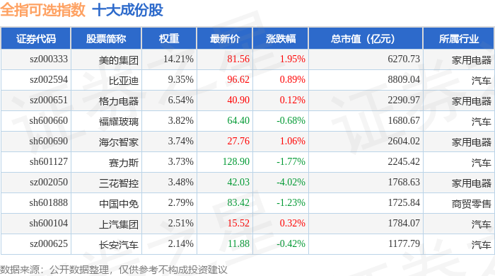 证券之星消息,12月2日,全指可选(000989)指数报收于5446.74点,跌0.12%,成交559.5亿元,换手率1.38%。当日该指数成份股中,上涨的有45家,莱克电气以6.75%的涨幅领涨,下跌的有62家,森马服饰以6.29%的跌幅领跌。