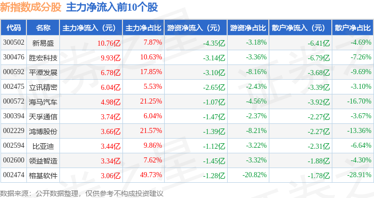资金流向方面,新指数(399100)成份股当日主力资金净流出合计306.78亿元,游资资金净流入合计47.84亿元,散户资金净流入合计258.94亿元。成份股资金流向详情见下表: