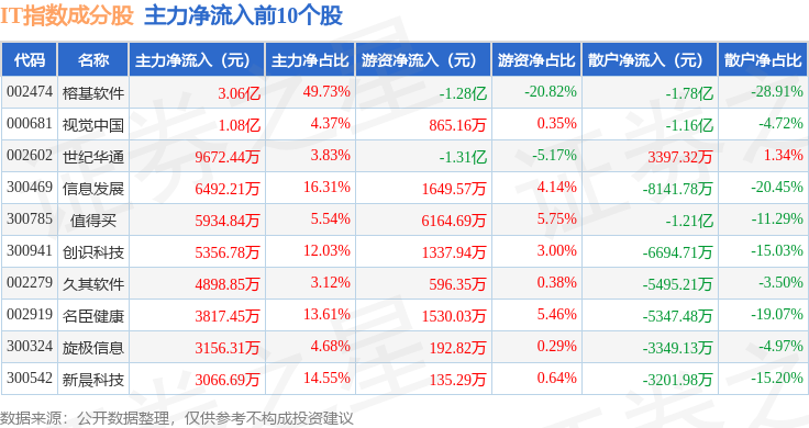 资金流向方面,IT指数(399239)成份股当日主力资金净流出合计42.92亿元,游资资金净流入合计11.7亿元,散户资金净流入合计31.22亿元。成份股资金流向详情见下表: