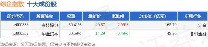 证券之星消息,12月2日,综企指数(399249)报收于3358.62点,涨2.1%,成交17.92亿元,换手率10.9%。当日该指数成份股中,上涨的有1家,粤桂股份以2.99%的涨幅领涨,下跌的有1家,华金资本以0.49%的跌幅领跌。